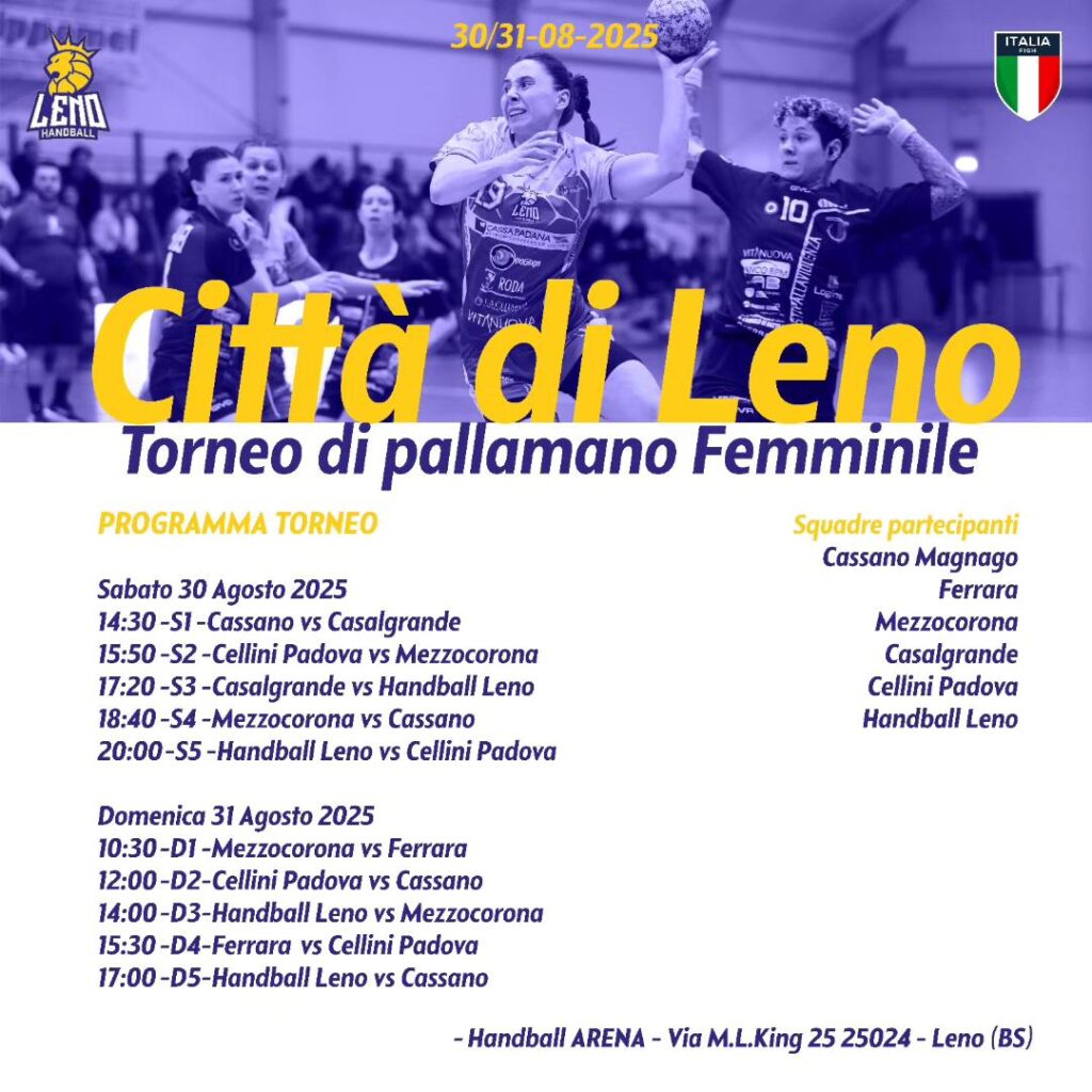 TORNEO CITTA’ DI LENO. E dunque, come rimarcato da Elena Barani, a breve la Casalgrande Padana si cimenterà col secondo e ultimo appuntamento precampionato: nell’occasione, la compagine ceramica sarà a ranghi più completi. Riflettori puntati sulla Handball Arena di Leno, in terra lombarda, dove nel prossimo fine settimana andrà in scena una competizione che coinvolgerà mezza serie A1. Oltre alla Casalgrande Padana e alle gialloblù di casa, il tabellone comprende anche Cassano Magnago, Securfox Ariosto Ferrara, Mezzocorona e Cellini Padova. Il programma gare si estenderà nelle giornate di sabato 30 e domenica 31 agosto, ma le biancorosse giocheranno soltanto sabato 30: dalle ore 14.30 contro Cassano Magnago allenata da Davide Kolec, e dalle ore 17.20 contro Leno allenata da Carlos Alberto Britos. Peraltro Leno sarà la prima rivale della Casalgrande Padana in campionato: sabato 6 settembre, sul campo bresciano.
